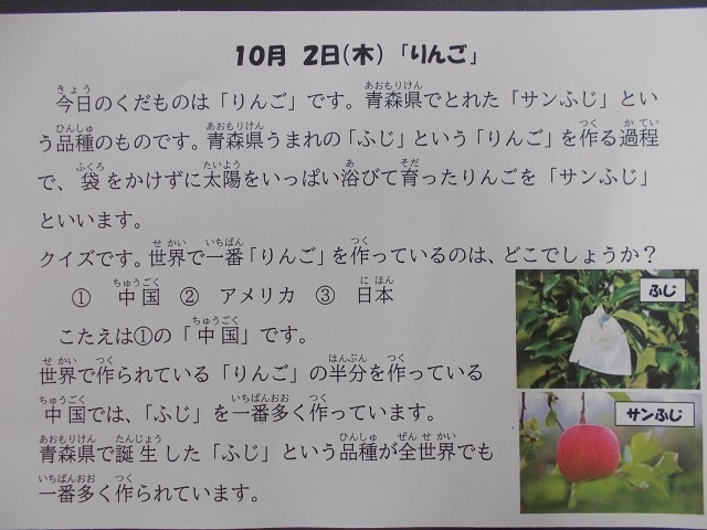 写真は機械でりんごの皮をむいている様子です。今日は70個のりんごが納品されました。機械で皮をむいてから、芯やむき残しの皮を包丁で丁寧に取り除きます。