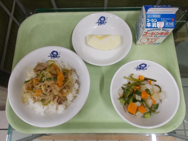 今日のスタミナやきにく丼は、豚肉と野菜たっぷりでした。にんにくとしょうがで下味をつけているのでご飯が進みます。どのクラスもよく食べていました。