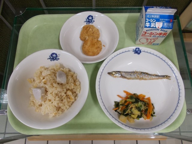里芋ごはんには、今が旬のさといもをたくさん入れてご飯に炊き込みました。かつおだしで炊いたので、かつおの風味も感じられて、やさしい味わいでした。