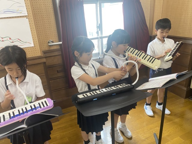 2年生は、「山のポルカ」で発表会に向けて鍵盤ハーモニカの分担奏の中間発表をしました。
