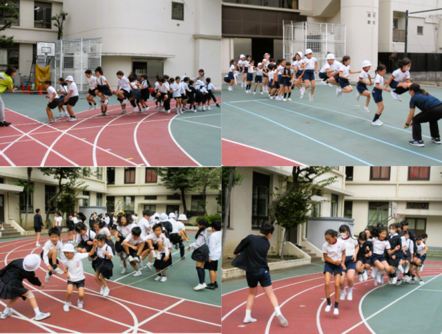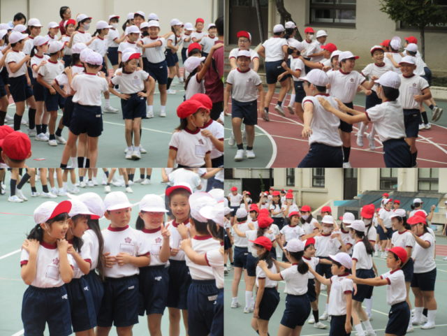 体育朝会がありました。フォークダンスのジェンカを踊りながら、じゃんけん列車を作っていきました。みんな楽しく体を動かしていました。
