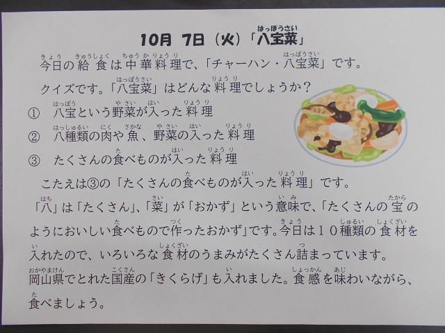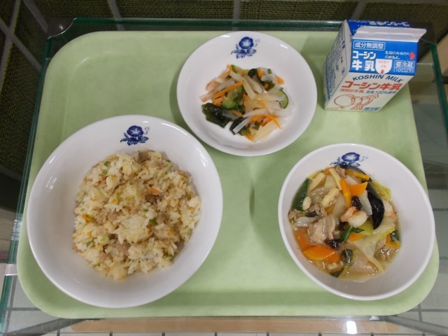 今日のチャーハンはシンプルな味付けでした。豚ひき肉・ねぎ・ピーマン・にんじんを塩こしょうで炒めてご飯に混ぜ合わせ、最後に焦がししょうゆで風味良く仕上げています。ピーマンは細かく刻んでボイルしてから、炒め合わせています。ピーマンが苦手でも食べやすいようで、みんなしっかり食べていました。