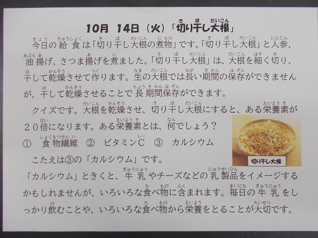 切り干し大根の煮物はカルシウムたっぷりの副菜です。食べ慣れない様子が見られました。切干大根はカルシウムだけでなく食物繊維や鉄分も摂れるので、家庭でも進んで取り入れてもらいたい食材のひとつです。