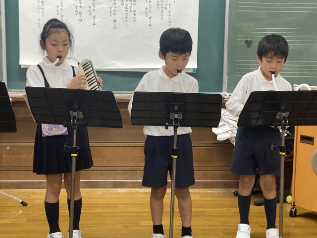 1年生では、鍵盤ハーモニカと歌の合奏「なかよし」の発表会をしました。