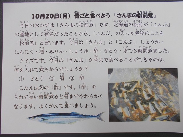 さんまの松前煮は、さんまの旬であるこの時期に、毎年給食で出している献立です。3時間、ことこと煮込んでいるので骨までやわらかく、安全に食べられました。カルシウムがとれるので、骨まで残さずしっかり食べてほしいメニューです。苦手な児童もいますが、毎年出すことでだんだん食べられるようになる子も多く、さんまの松前煮をリクエストする児童もいます。さんまと一緒に煮たこんぶも味がしみしみでおいしいです。ご飯のおともにぴったりで、よく食べていました。