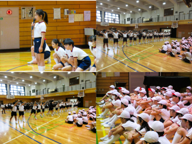 児童朝会の後は、23日(木)に連合運動会に参加する6年生の壮行会を行いました。50m走、100m走、走り高跳び、走り幅跳び、50mH走と各種目に出場する選手の紹介とそれぞれのエールを5年生が行ってくれました。