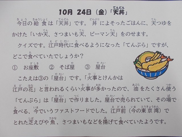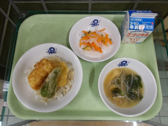 今日はいか・さつまいも・ピーマンの天ぷらをご飯にのせ、天つゆをかけて天丼にしました。いかはやわらかく、さつまいもは甘くてほっくり、ピーマンは天ぷらにすると食べやすくなるようで、残さず食べている子が多かったです。かつおだしで作った天つゆがおいしかったですね。