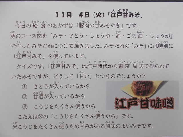 今日のおかずは豚ロース肉に甘みそだれを漬け込み(写真)、オーブンで焼きました。江戸・東京の代表的な「江戸甘みそ」というみそを使いました。「江戸甘みそ」は、通常の倍以上の米こうじを使うため、たっぷりの甘みと少ない塩分を特徴としたみそです。酒やみじん切りにしたしょうがも一緒に漬け込んだので、しっかり焼いていますが豚肉はやわらかく、しょうがの風味と香ばしいみその味わいを楽しめました。ご飯が進む味付けで、ご飯もよく食べていました。