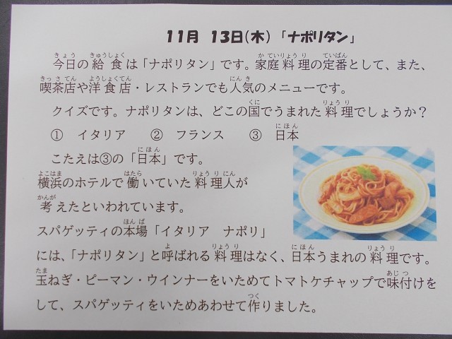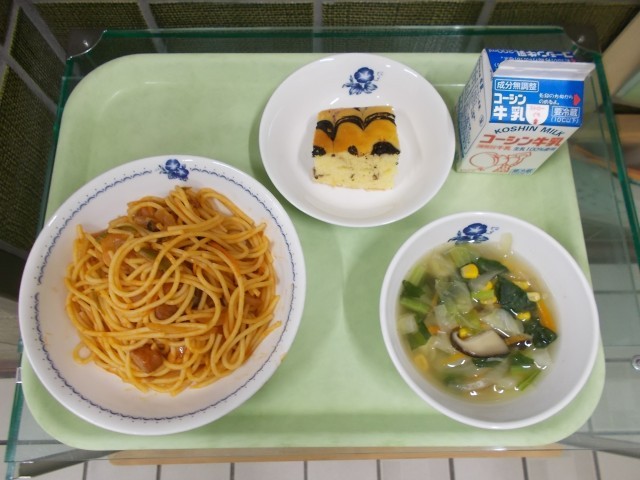 今日のナポリタンは、ウインナー・ベーコン・玉ねぎ・にんじん・ピーマン・しめじを炒めてケチャップとトマトピューレ・調味料を入れてケチャップソースを作り、そこにゆでたスパゲッティを混ぜ合わせて作りました。ちょうどよい炒め加減で、玉ねぎのシャキシャキ感も楽しめました。ナポリタンはみんな大好きで、どのクラスもよく食べていました。