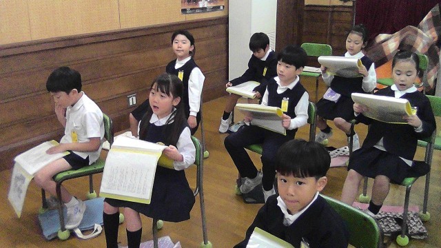 1年生は今月の歌の「スマイル」を覚えた後、「やまびこさんごっこ」の歌唱から、