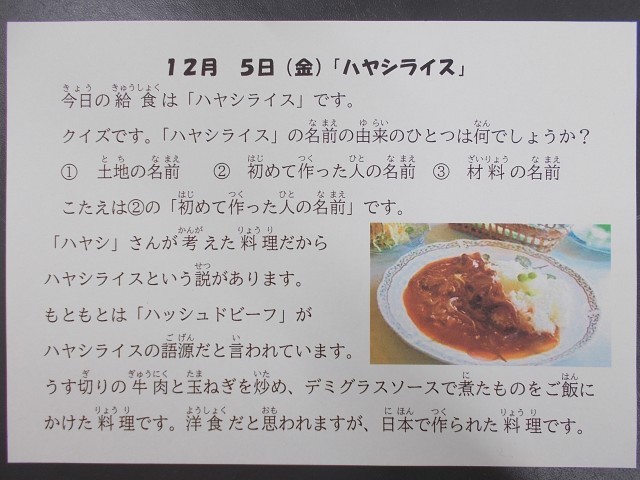 給食のハヤシライスは、ルーから手作りです。小麦粉とサラダ油をよく炒めてルーを作り、ルーでとろみをつけています。ハヤシライスには玉ねぎをたっぷり使っていますが、しっかりよく炒めて玉ねぎの甘みを出しています。トマトの酸味もマイルドになり、食べやすかったと思います。ごはんも残さずしっかり食べていました。
