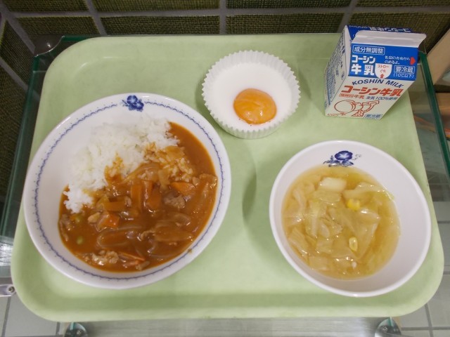 不思議な目玉焼きは黄桃缶を黄身に見立てて、牛乳寒天を白身に見立てています。黄身(黄桃缶)を先に食べる子や、白身(牛乳寒天)を先に食べる子、黄身も白身もどちらも一緒に食べる子、さまざまです。児童・教職員からも人気のデザートです。
