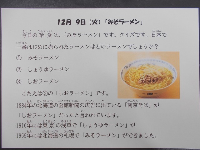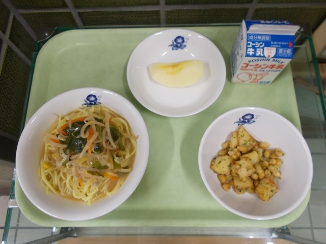みそラーメンは、鶏がらでとったスープをベースに、赤みそと白みそをかけあわせてスープを作っています。はじめに香味野菜(にんにく・しょうが・長ねぎ)と豚ひき肉を炒めるので、給食室からいい香りが広がっていました。野菜もたっぷり、おいしくいただきました。