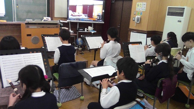 4年生は、6年生を送る会で演奏する合同合奏のリコーダーの旋律を練習しました。