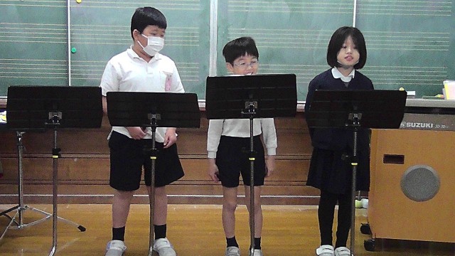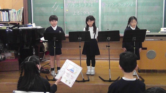 拍子の違いを楽しんで演奏しました。その後、歌唱「ふじ山」のグループ発表をしました。