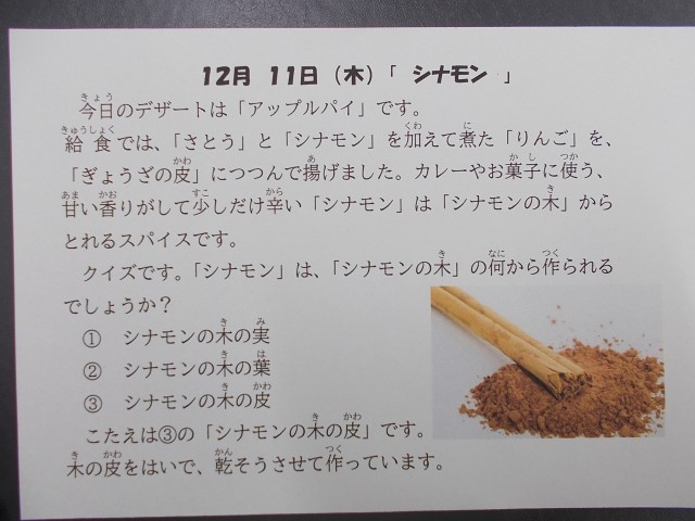 アップルパイは、いちょう切りにしたりんごを砂糖とシナモンで煮てフィリングを作り、餃子の皮に包んで油で揚げて作りました。餃子かと思った!という児童、先生が何人かいました。甘く煮たりんごと餃子の皮のパリパリ食感がおいしかったですね。