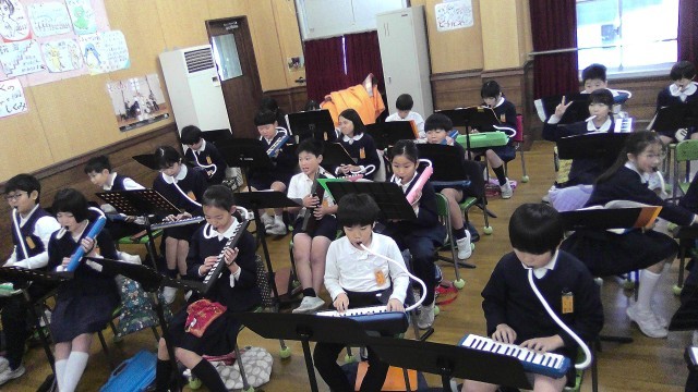 4年生は、学年合同合奏の曲の鍵盤ハーモニカの旋律を覚えました。