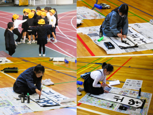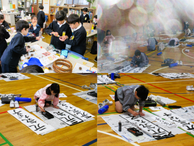 今日は4年生と3年生が書き初めを体育館で行いました。3年生は毛筆で行う初めての書き初めになります。上手に書けたでしょうか。