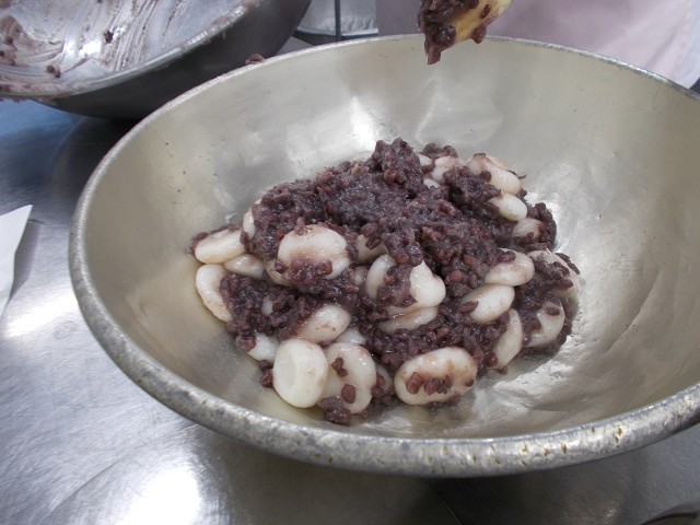 今日は鏡開きの献立です。手作りの白玉団子に、給食室で炊いたあずきをからめて、配缶します。黒門小の給食室で作る白玉団子は、白玉粉と上新粉と水をこねて作っています。もちもちですが、歯切れよく食べられます。あずきは甘さ控えめで作ったので、食べやすかったと思います。