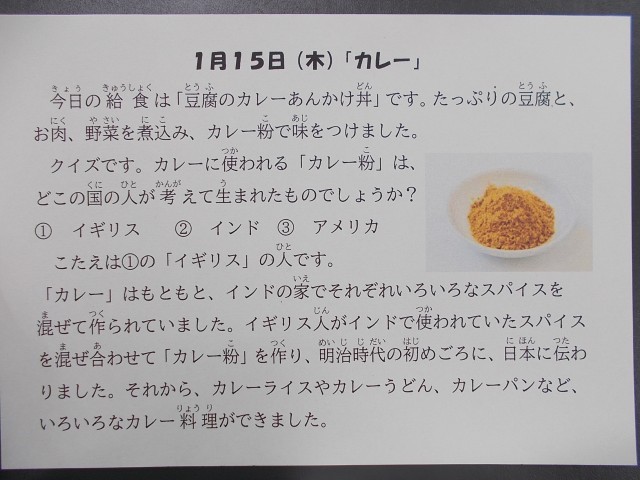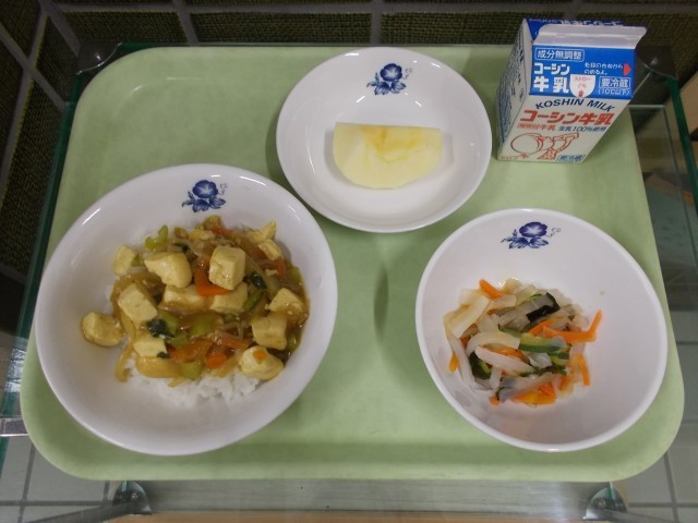 今日は豆腐を使ったカレー味のあんかけ丼にしました。でんぷん(片栗粉)でとろみを付けているので、ルーで作るカレーライスとは味わいや香り、とろみの付き方が違います。また、具材も豚肉や豆腐・もやし・こまつなを入れているので、和風な味わいです。辛さは抑えめで作っているので、低学年の児童もおいしく食べられました。