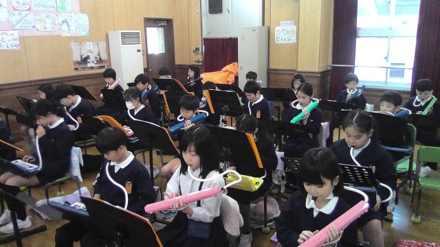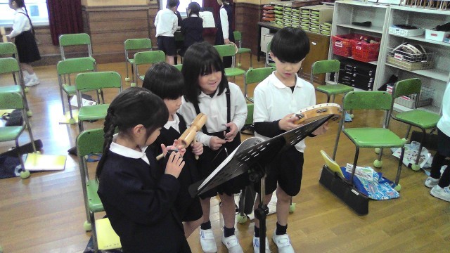 1年生は、楽器を演奏する順番や楽器を分担して「さがしてみよう ならしてみよう」の合奏の練習をしました。打楽器を叩く場所によって、全然音が違うことに注目して、歌詞の内容に合わせて演奏を工夫しているグループが沢山ありました。4年生は学年末にある学年合同合奏の練習が始まりました。この日は各パートの楽器の紹介もあり、どの楽器が自分の力を最大限発揮できるか、授業後半に楽器に実際に触れながら考えていました。