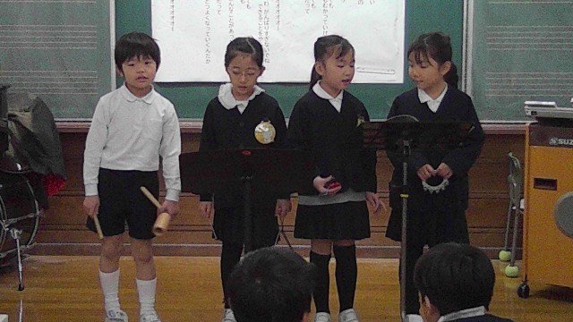 1年生は、「さがしてみよう ならしてみよう」の歌と打楽器の合奏をグループ発表しました。