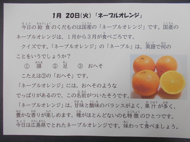 今日の果物は、広島県産のネーブルオレンジでした。国産のネーブルオレンジは今の時期が旬です。甘味と酸味のバランスがよく、果汁たっぷりでおいしいオレンジでした。