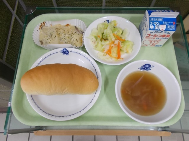 今日は手作りのホワイトソースで作ったポテトグラタンでした。じゃがいもの甘み・しっとりとした食感となめらかなホワイトソースがよく合っていて、おいしくできました。グラタンが好きな児童は多く、どのクラスでもよく食べていました。