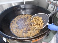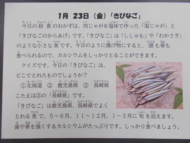 「きびなごのからあげ」は、小麦粉と卵で作った衣をまぶしてしっかり油で揚げているので骨までおいしく食べられます。魚が苦手な児童も食べやすいようです。どのクラスでもよく食べていました。