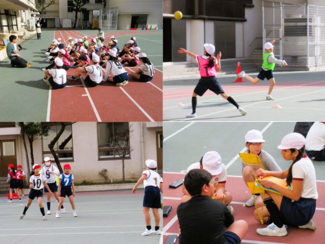 5校時には、3年生の体育の授業を見ました。ハンドボールゲームでゲームを行いながら、ルールの工夫を考えていました。
