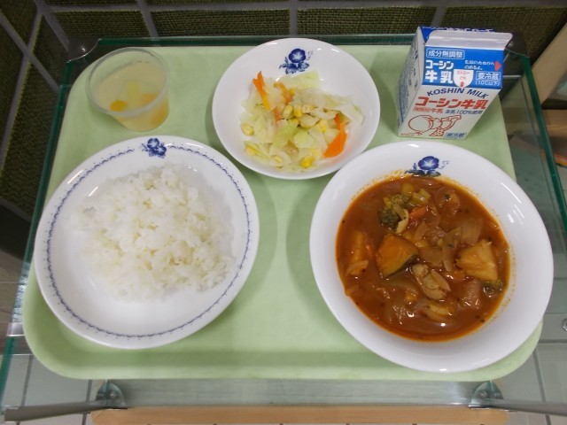 スープカレーはルーを使わない、サラサラのカレーです。今日はじゃがいもとかぼちゃを素揚げにして、仕上げに入れました。じゃがいも・かぼちゃは煮崩れることなく、ほくほく・しっとりの食感を味わえました。鶏がらでとったスープに角切りの鶏肉を入れたので、鶏肉のうまみもしっかり味わえました。しっかりよく炒めた玉ねぎの甘みや、セロリーの風味、エリンギの食感など、一品でいろいろな味わいを楽しめるようにしました。今が旬のブロッコリーも入れました。ブロッコリーの芯も捨てずに食べやすいように切って入れています。具材たっぷりで食べ応えのあるスープカレーになりました。どうやって食べるのかな?と考えながら食べる児童の姿が見られました。