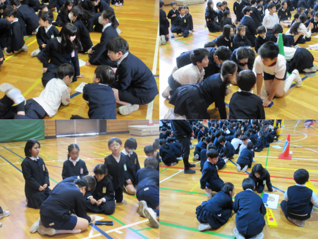 児童集会がありました。今日は集会委員が冬に関係する言葉を1語ずつ同時に言った言葉を当てるゲームでした。なかよし班で耳を澄ませながら言葉を当てていました。
