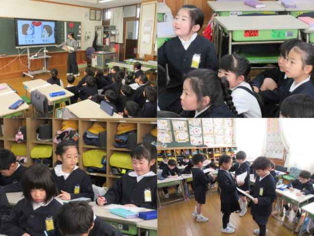 今日は1年生の道徳の授業を見ました。教材を通しながら、誰にでも特別扱いしてしまう気持ちがあることや、周りのことを考えて行動することの大切に気付くことをねらいとしています。ワークシートに書いた自分の考えを友達同士交流し合いました。最後に自分の行動や生活について振り返っていました。