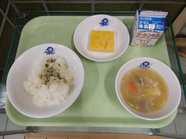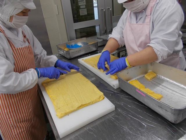 今日の卵焼きは、きれいな黄色でとてもなめらかでした。いつもの卵焼きよりも具の種類が少ないので、卵をしっかり味わえました。1年生の児童から「この卵焼きはどこで買ったの?」と聞かれましたが、給食室で作っています。300個ほどの卵を割るところから、給食室で行っています。卵液を鉄板に流し入れて、オーブンで焼いてカットして配缶します。写真はカットしている様子です。低学年・中学年・高学年で大きさを変えてカットしています。