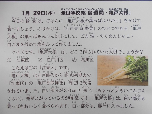 今日は江戸東京野菜の一つである、亀戸大根を使いました。東京都産の亀戸大根です。また、豚汁にも東京都産の長ねぎを使いました。地産地消が難しい東京ですが、給食では積極的に東京都産の農産物を取り入れ、地産地消の推進を図っています。