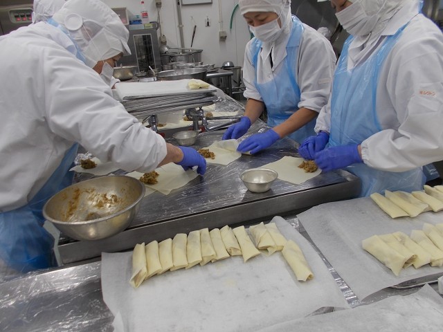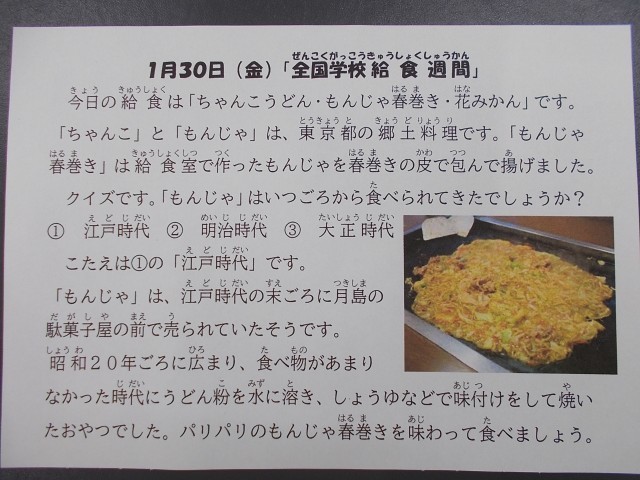 今日の春巻きは、しょうゆとソースで味を付けたもんじゃを春巻きの皮に包んで、きつね色になるまで揚げて作りました。中がトロッとして、皮はパリパリでおいしかったですね。食べてびっくり!の人も多かったと思います。黒門小では初めて出したメニューです。みんな残さず食べてくれて、おいしくできてよかったです。