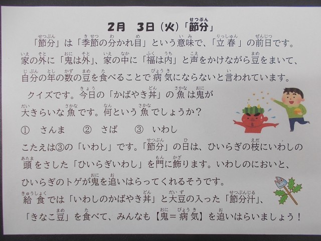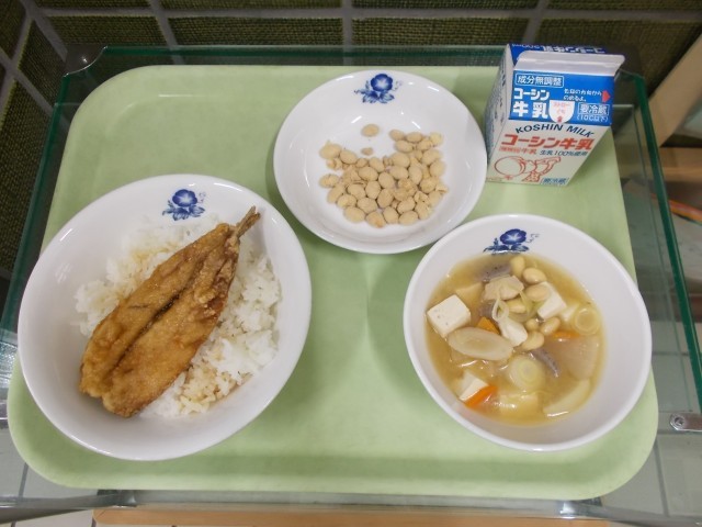 給食ではいわしを使ってかば焼き丼にしました。開いたいわしに下味をつけて、でんぷんと米粉をまぶして油で揚げ、タレをかけてごはんと一緒にいただきます。下味にしょうがをたっぷり使ったので臭みを感じることなくおいしく食べられました。タレをご飯にかけて食べるのもおいしいですね。しっかり揚がっているので骨までカリカリおいしく食べられました。
