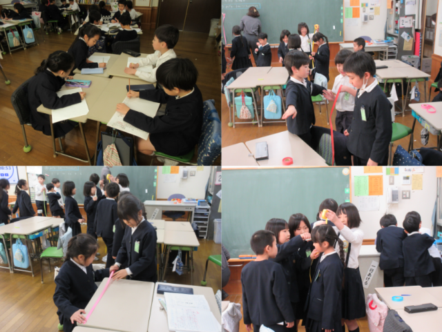 今日は2年生の算数を見ました。1mの長さを予想して紙テープを切りました。どのグループもほぼ1mの長さになっていて、量感がよくつかめていると思いました。