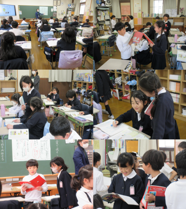 それから3年生の国語の授業を見ました。「すごい」の言葉を様子や気持ちが伝わるように別の言葉に置き換える学習でした。友達との交流が活発に行われていました。最後の振り返りでは「いつも『すごい』と言っているので気を付けようと思った」「分かりやすい言葉を使おうと思った」などの感想があがりました。