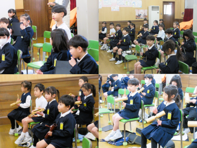 今日は、1年生の音楽の授業を見ました。「シンコペーテッド・クロック」を聞き、どんな様子の時計か実際にウッドブロックとトライアングルを演奏しながら想像しました。曲から感じ取ったことを積極的に発表していました。