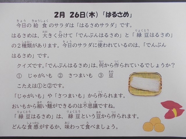 今日はおわかれ給食会(縦割り班での給食)なので、配膳しやすく食べやすい献立にしました。
