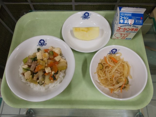豆腐を使った中華丼は、みじんぎりにしたにんにく・しょうがをごま油で炒めて風味をしっかり出してから具材を加え炒め、煮込みました。野菜もたっぷりとれるようにしました。