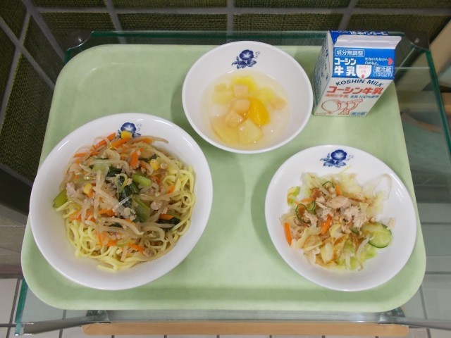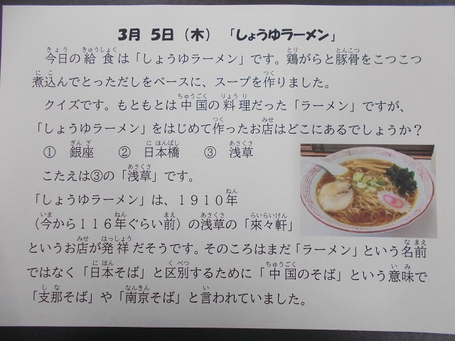 今日は6年生のリクエスト給食上位の「しょうゆラーメン」でした。にんにく・しょうが・ねぎと豚ひき肉を炒めたところに鶏がらと豚骨でとったスープを入れ、野菜をたっぷり煮込んでスープを作りました。給食のラーメンは塩分は控えめにして、野菜をしっかりとれるようにしています。