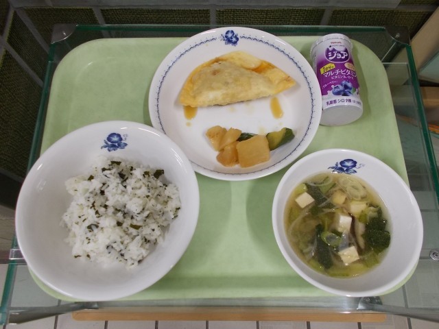 今日のわかめご飯とジャンボ餃子は6年生のリクエストメニューです。わかめご飯にはちりめんじゃこを入れてカルシウムが摂れるようにしました。どの学年でも人気のメニューです。