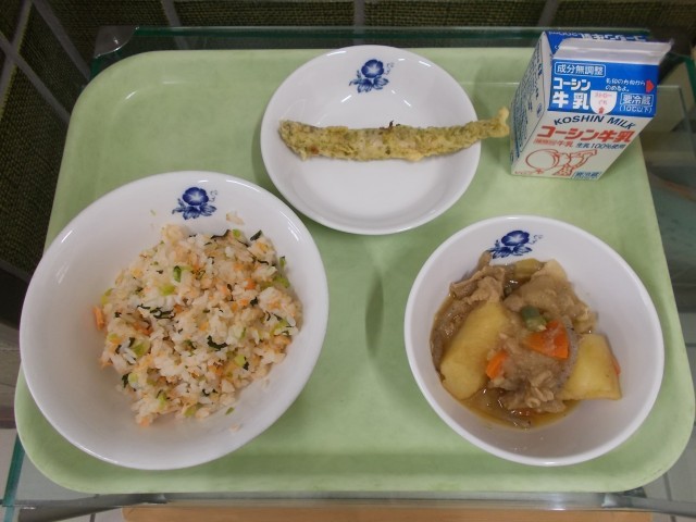ししゃもの磯辺揚げは、小麦粉・卵・青のりを混ぜた衣をししゃもにまぶして油で揚げました。衣がふかふかで青のりの香りも感じられるので、魚が苦手な児童も食べやすいようです。