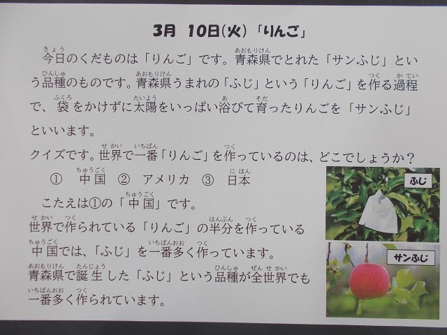 りんごは青森県産の「サンふじ」というりんごで、甘味と食感を楽しんで食べられました。りんごの皮は皮むき器でおおかたむけますが、むき残しと芯の部分は包丁で切り落とします。そのあと変色防止で塩水につけてから配缶します。児童が配りやすいように、きれいに並べて配缶しています。