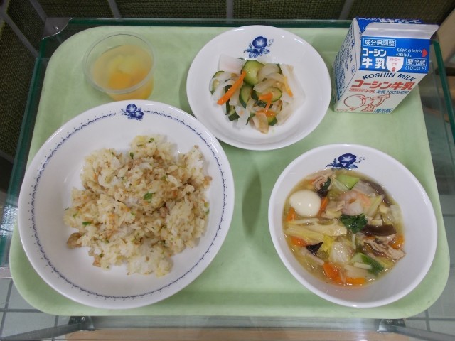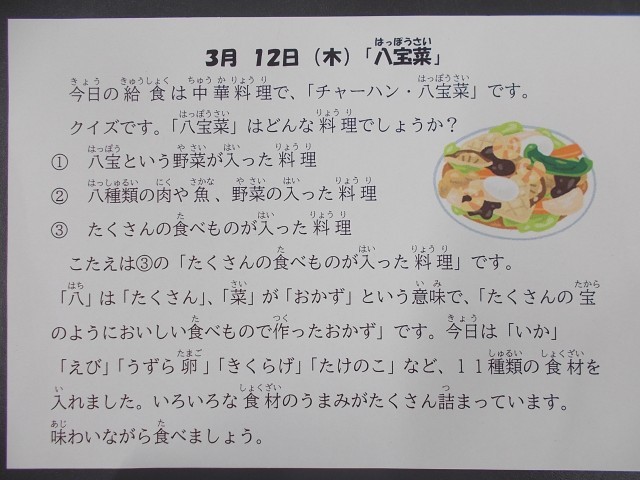 今日の八宝菜には、たくさんの具材(豚肉・うずら卵・にんじん・玉ねぎ・はくさい・たけのこ・きくらげ・干し椎茸・えび・いか・チンゲイサイ)を入れました。11種類の具材のうま味がしっかり出ていました。おいしかったですね。