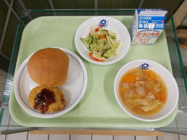今日は給食室でいちから手作りしたコロッケでした。豚ひき肉と玉ねぎを炒めて冷まして、蒸してつぶしたじゃがいもを混ぜ合わせ、俵型に成形しパン粉を付けて油で揚げました。じゃがいもは30kg使いました。皮をむき、カットして、蒸してつぶして・・・すべて手作業です。一つずつ丁寧に作業してくださっています。衣はサクサク・中身はなめらかでおいしいコロッケになりました。丸パンにコロッケをはさんでコロッケバーガーにして食べている児童もいました。