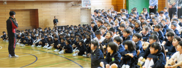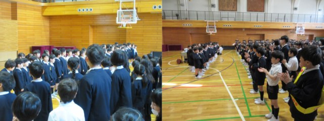 児童朝会の前に1年生との対面の会がありました。今日から全校児童がそろって朝会や集会に参加することになります。1年生から「よろしくお願いします」とあいさつがあり、2~6年生が拍手で歓迎しました。