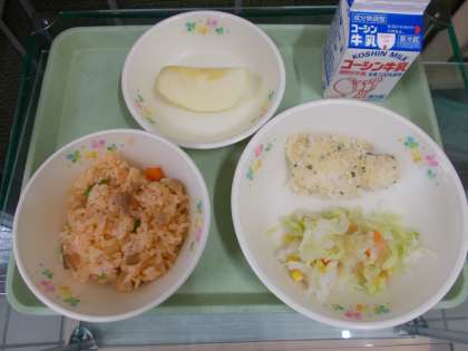白身魚のパン粉焼きは、メルルーサに下味をつけ、パン粉をふって焼きました。写真は、焼く前です。パン粉には粉チーズとパセリが入っています。パン粉をかぶせて焼いているからか、パサつきはありませんでした。前回、パン粉が多くて調理員さんが配缶するのが大変そうだったので(宝探しみたいだったので)量を調節しました。子供たちも配膳しやすかったかな、と思います。(よろしければ、5月19日の給食も見てみてください。)給食のような大量調理だと、「適量」というのが難しいです。日々、試行錯誤しながらやっています。
